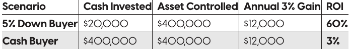 Let’s say you put 5% down on a $400,000 home. You invest $20,000, but you now control a $400,000 asset. You get all the benefits of ownership — stability, tax advantages, and long-term appreciation — without needing the full purchase price in cash.